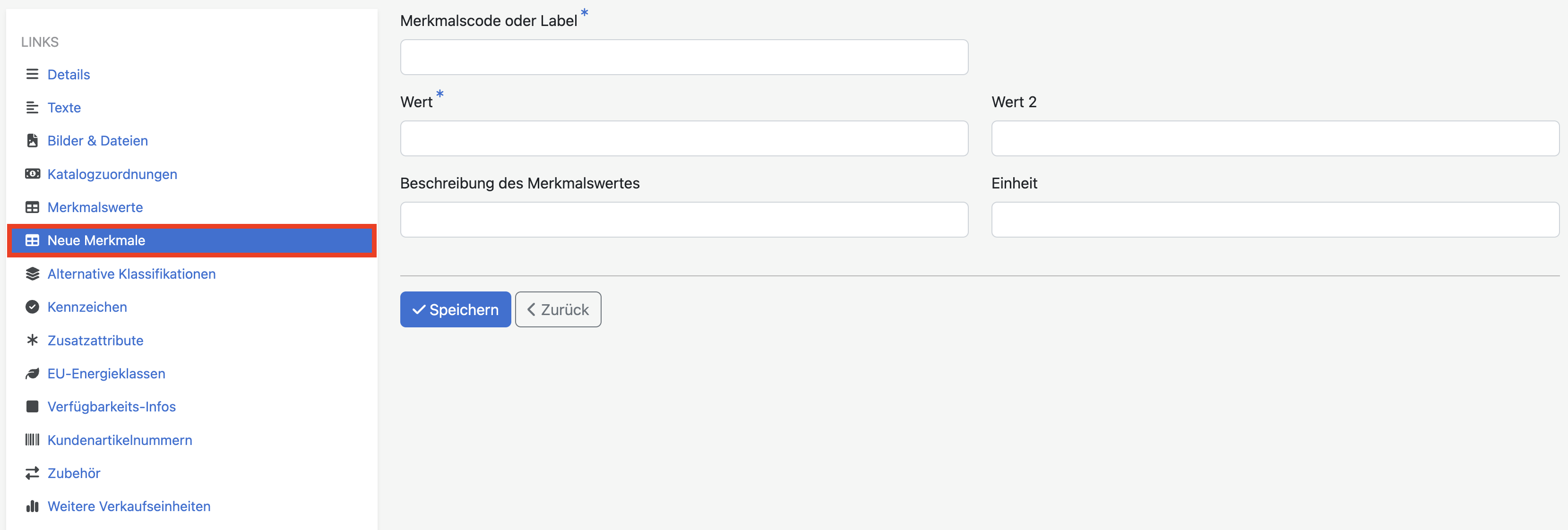 Ersetzen die bisherigen Merkmale und Merkmalswerte und dienen der erweiterten Beschreibung eines Artikels, z.B. Artikelabmessungen (keine logistischen Maße).